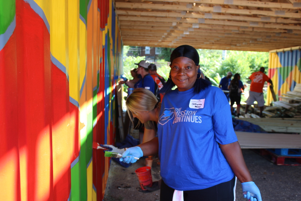 The Home Depot Foundation, our Daily Sponsor, also joined us. Steve Galliard said, “Serving with The Mission Continues means the world to us.” They complemented our sea of blue shirts with their sea of orange shirts for our last day of Mass Deployment. Big thanks to these awesome volunteers who helped us cross the finish line!